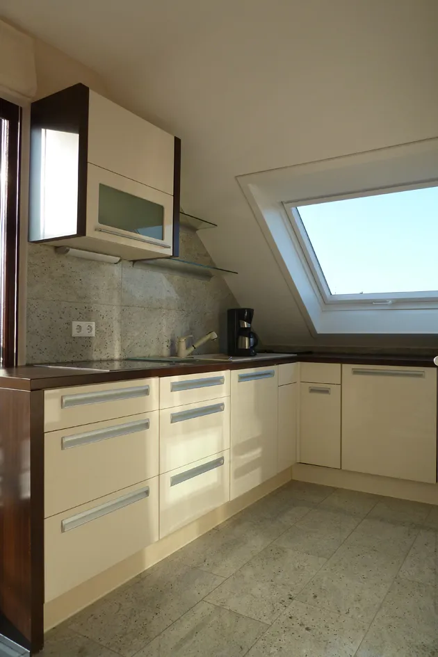 Die Küche der Ferienwohnung ist modern und komplett ausgestattet. Induktionskochfeld, Backofen, Kühl- und Gefrierkombination, Geschirrspüler, Kaffeemaschine und Wasserkocher stehen Ihnen zur Verfügung. Auch Geschirr, Besteck und Kochutensilien sind ausreichend vorhanden.