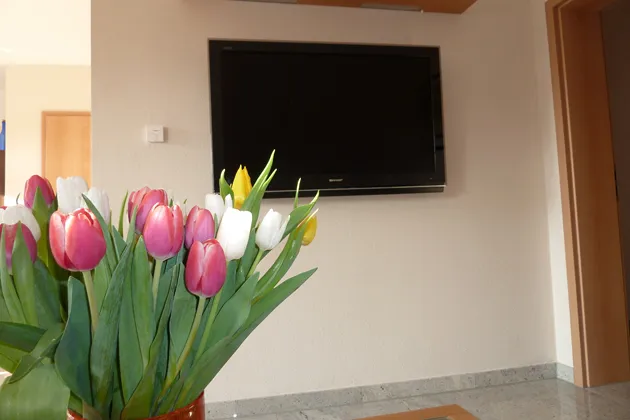 Ein großer Flachbildfernseher an der Wand sorgt für Unterhaltung nach Feierabend oder an ruhigen Tagen in der Ferienwohnung.