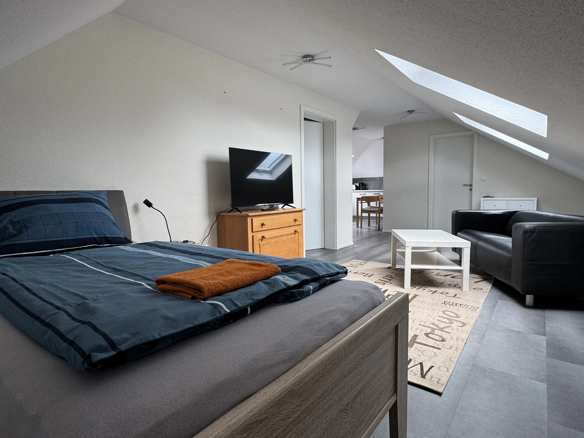 Der gemütliche Wohnbereich schließt direkt an die offene, lichtdurchflutete Küche an. Ein bequemes Sofa lädt zum Entspannen ein und kann bei Bedarf als zusätzliche Schlafmöglichkeit genutzt werden. Der große Flachbildfernseher sorgt für Unterhaltung nach einem langen Arbeitstag.