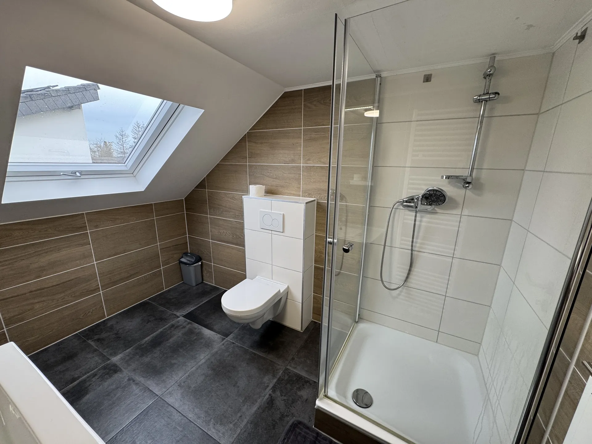 Das Badezimmer der Wohnung ist modern und großzügig gestaltet. Es verfügt über eine komfortable Eckdusche, ein WC und einen zeitgemäßen Waschtisch. Die helle Gestaltung sorgt für eine freundliche Atmosphäre und genügend Platz für die tägliche Morgen- und Abendroutine.