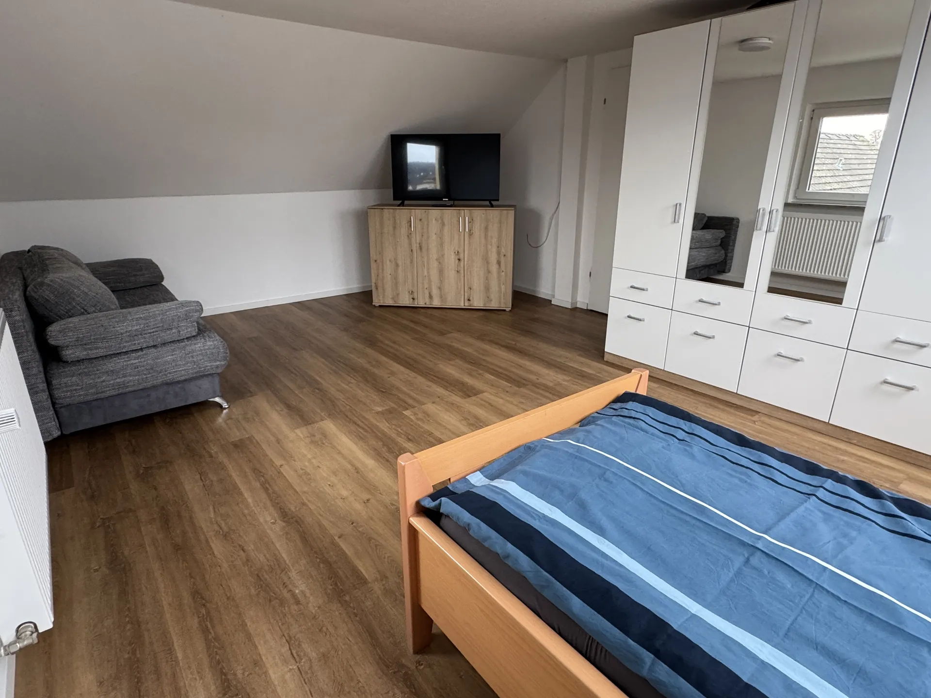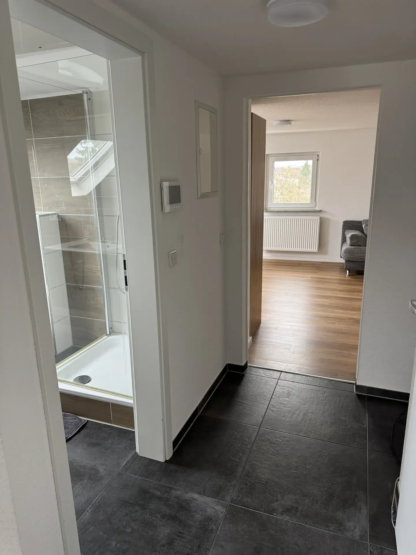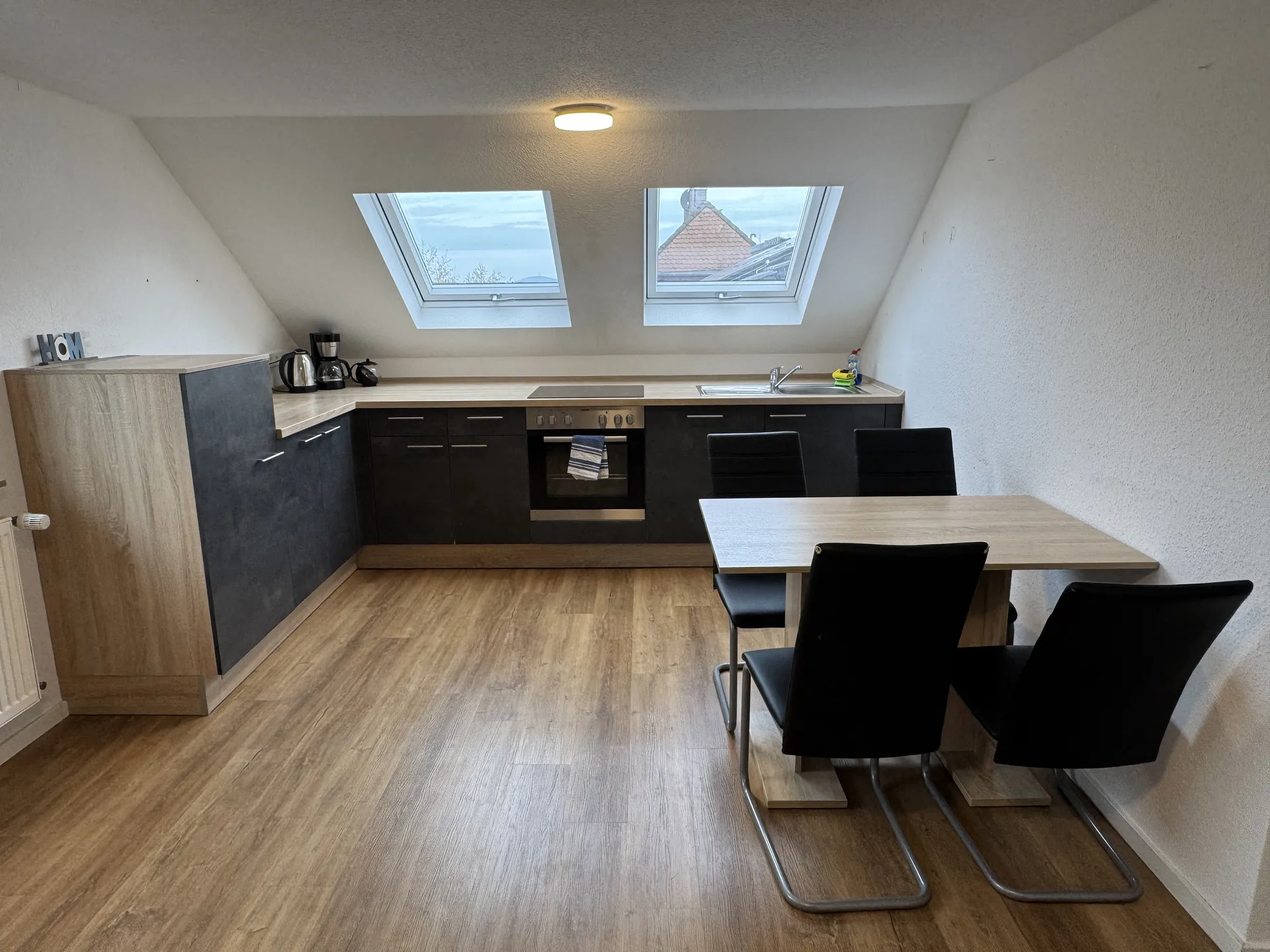 Helles Monteurzimmer in Pohlheim-Watzenborn mit großer Küche, separatem Schlafzimmer und modernem Duschbad – ideal für Bauleiter oder kleine Teams.