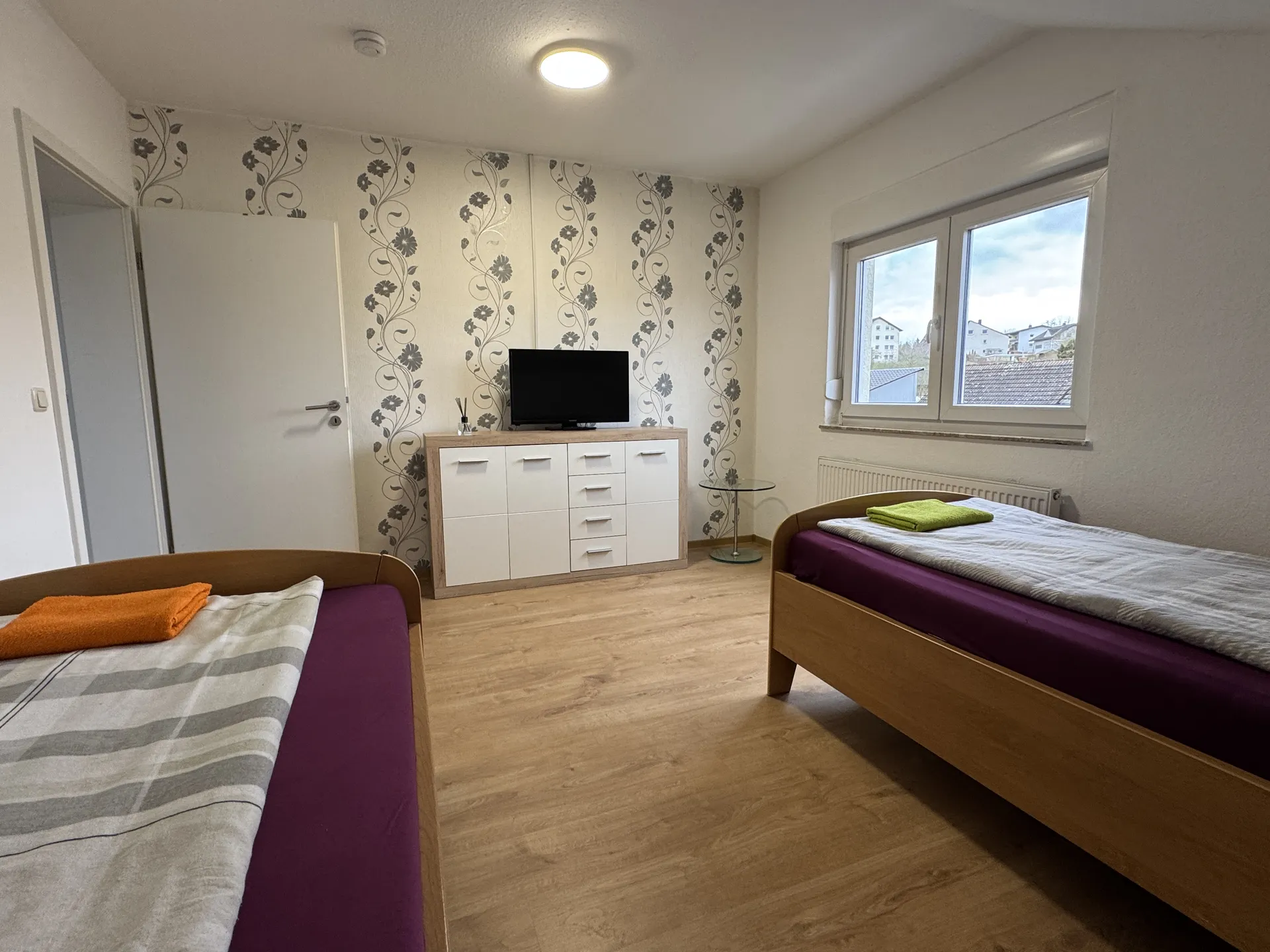 Das freundlich eingerichtete Schlafzimmer ist hell, hochwertig ausgestattet und bietet zwei komfortable Betten. Ein eigener Flachbildfernseher gehört ebenfalls zur Ausstattung, sodass Sie sich jederzeit zurückziehen und in Ruhe entspannen können.