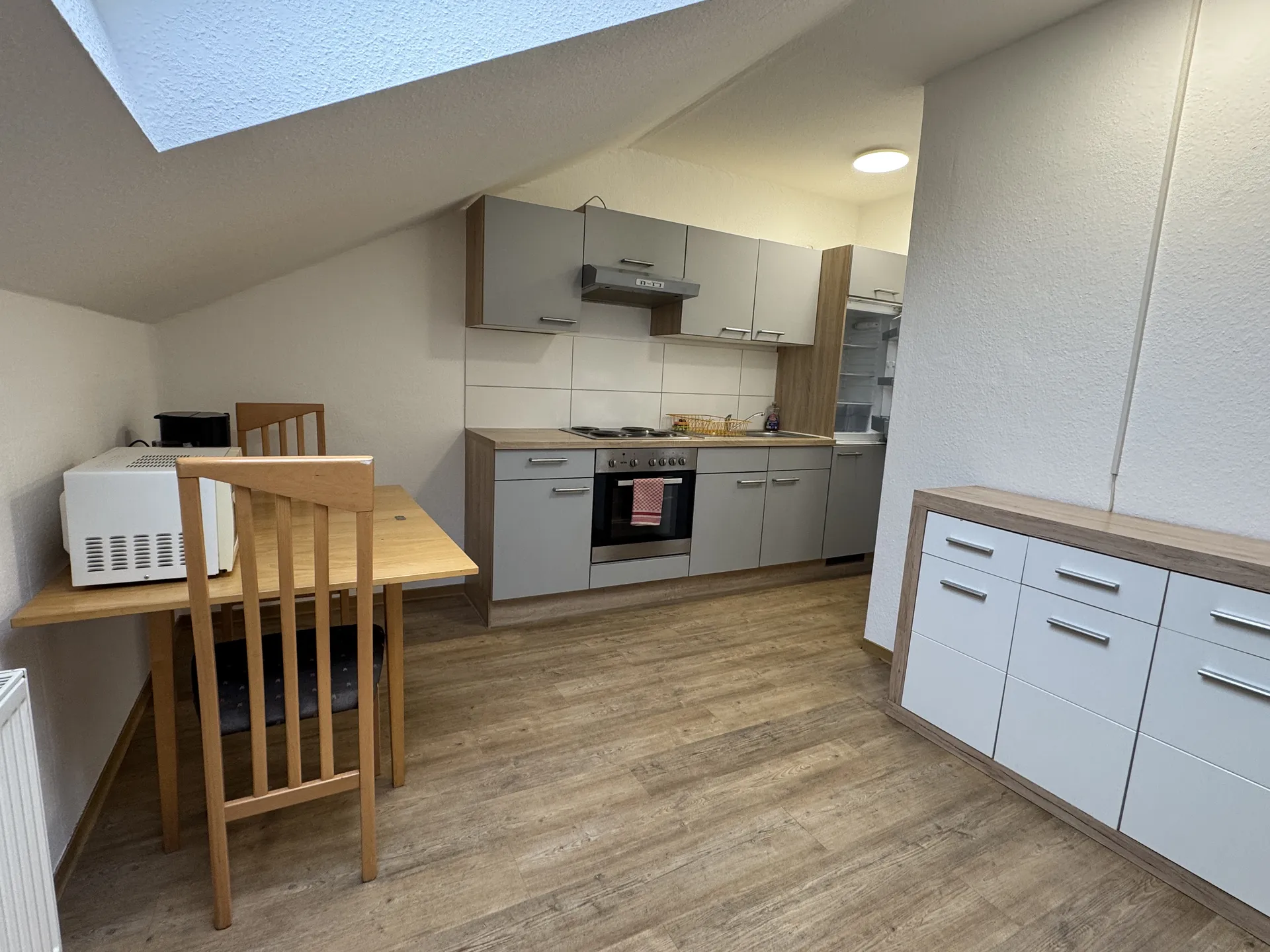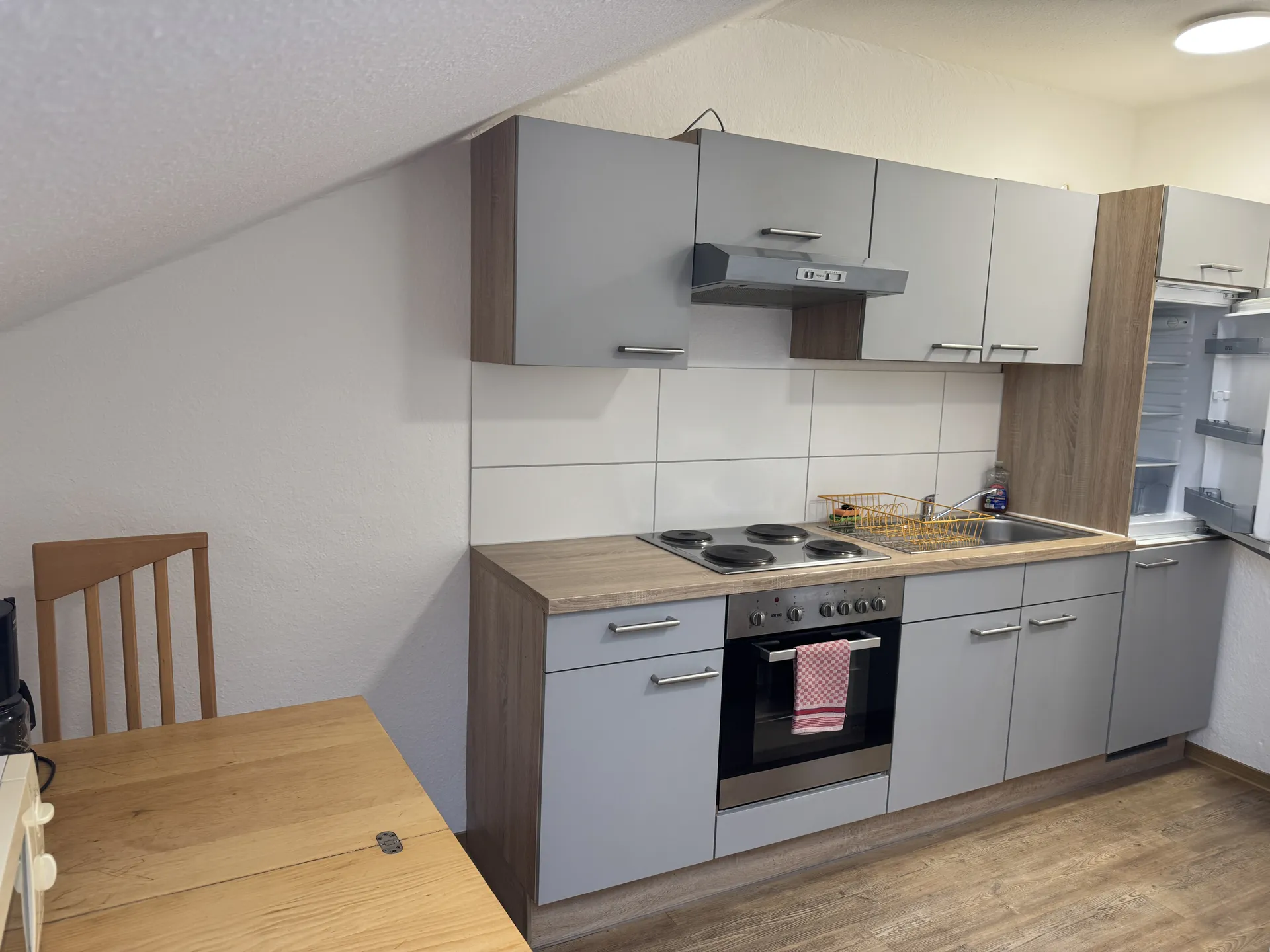 Modernes Monteurzimmer in Fernwald-Steinbach mit großer Wohnküche, separatem Schlafzimmer und geräumigem Bad – optimal für kleine Teams oder Bauleiter.